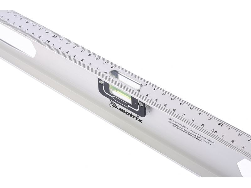 Алюминиевый уровень Matrix «Рельс» 34026 длиной 800 мм имеет 3 глазка: 2 для проверки отклонений от заданной вертикали и горизонтали и 1 поворотный для проверки наклонных поверхностей.