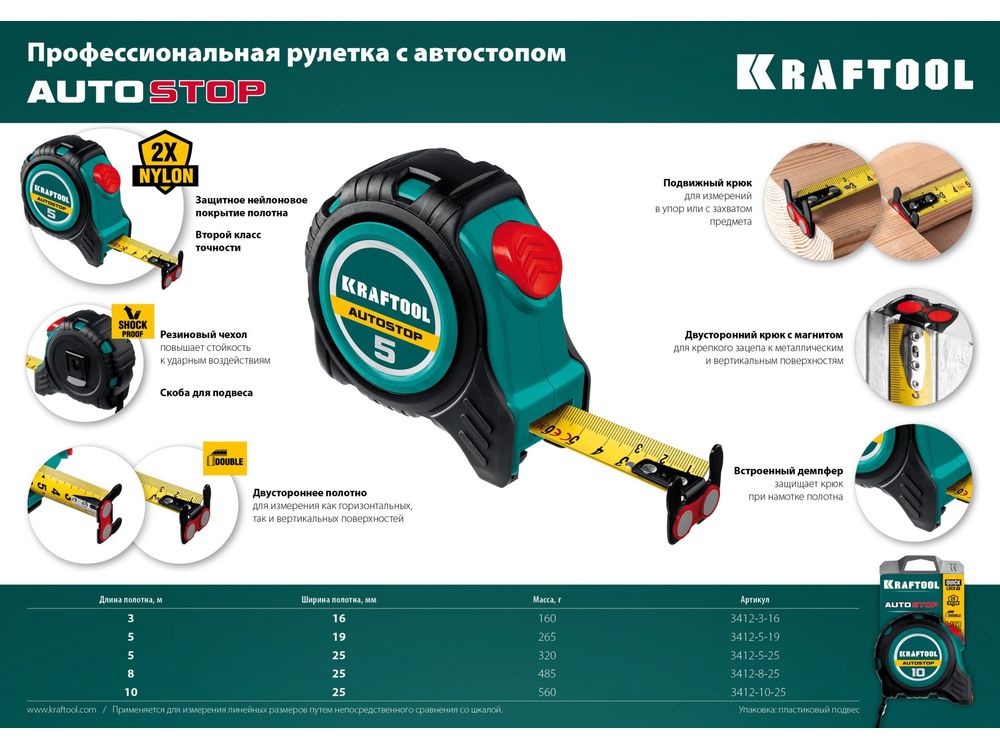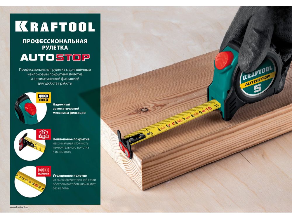 KRAFTOOL AutoStop 10м / 25мм профессиональная рулетка с автостопом