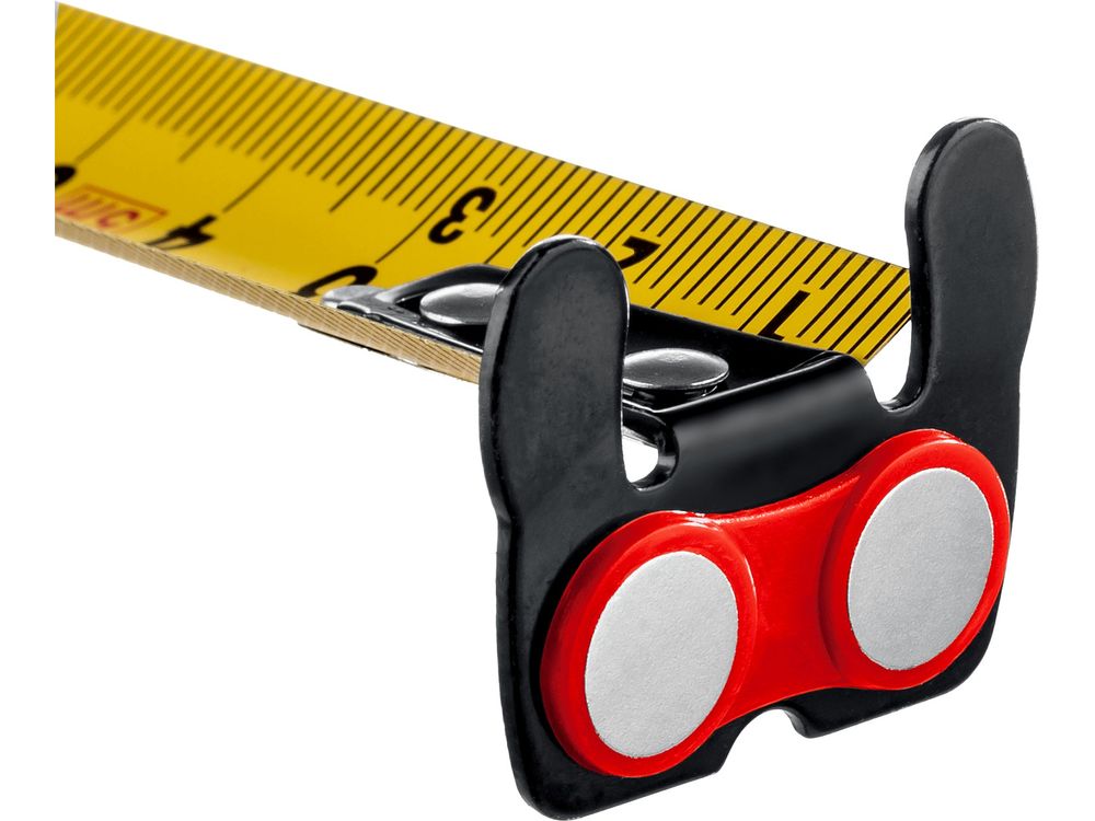 Преимущества Нейлоновое покрытие значительно увеличивает стойкость измерительного полотна к истиранию Автоматический фиксатор полотна для удобства работы Утолщенное полотно из высококачественной инструментальной стали Подвижный крюк с магнитом для повышения удобства при фиксации в упор и точности измерений Большой вылет полотна без излома Встроенный демпфер защищает крюк при намотке полотна Использование Для измерения линейных размеров путем непосредственного сравнения со шкалой