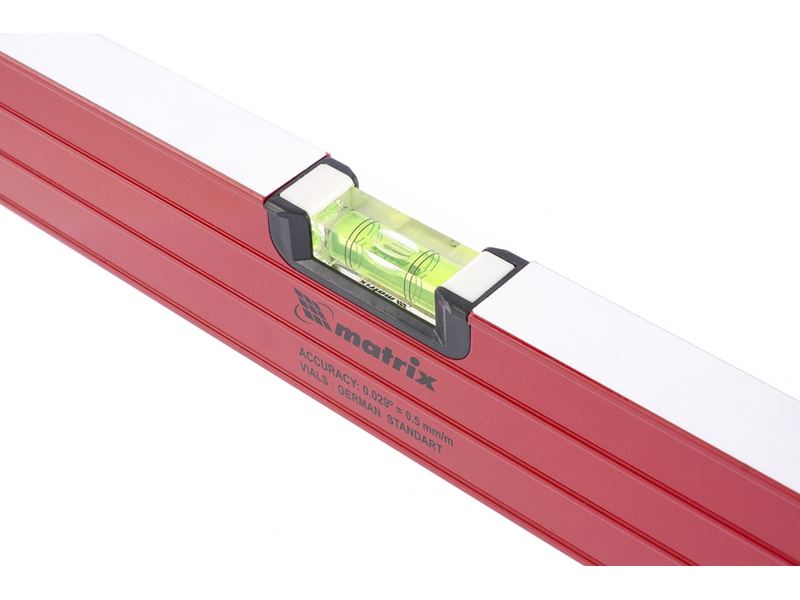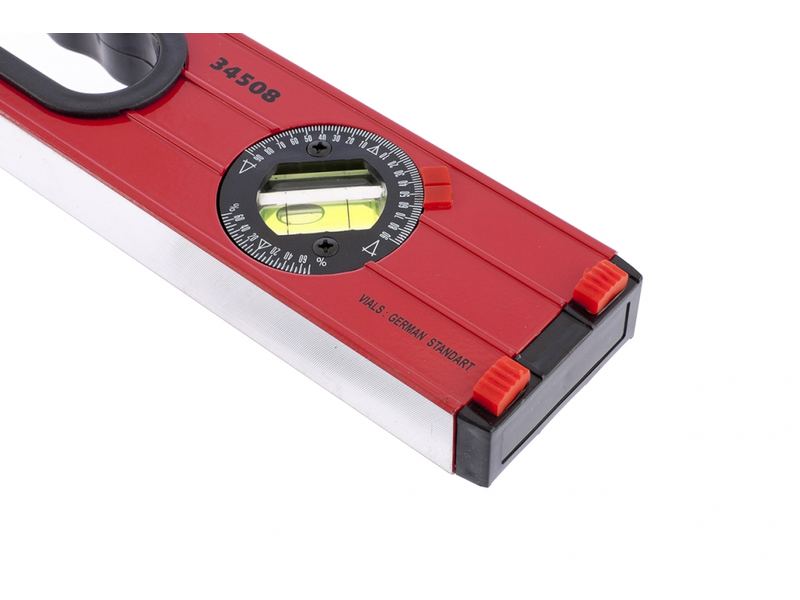 Имеет жесткий усиленный алюминиевый профиль с метрической шкалой и ребрами жесткости. Фрезерованная рабочая поверхность обеспечивает дополнительную точность измерения. Модель имеет два акриловых глазка для проверки отклонений по горизонтали и вертикали, а также регулируемый глазок для выверки произвольных углов. Точность измерений – 0,5 мм м. Пластиковые заглушки на концах имеют резиновые вставки, предотвращающие скольжение при измерениях на наклонных плоскостях. Ручки делают использование уровня максимально удобным.