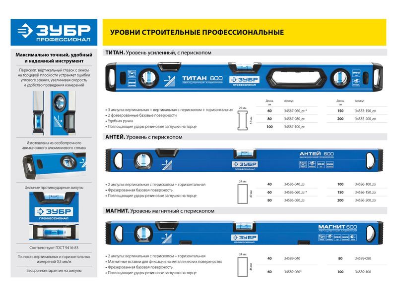 Купить Уровень ЗУБР ПРОФЕССИОНАЛ ТИТАН с перископом, усилен, с ручками, 2 фрезерован поверхн, 3 противоудар ампулы, 100см