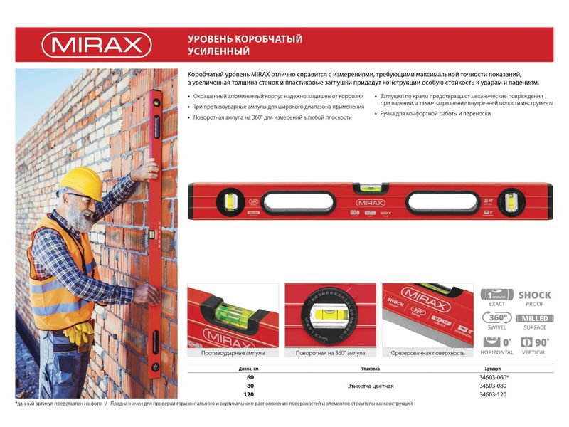 Профессиональный уровень MIRAX предназначен для контроля горизонтальности и вертикальности поверхностей.