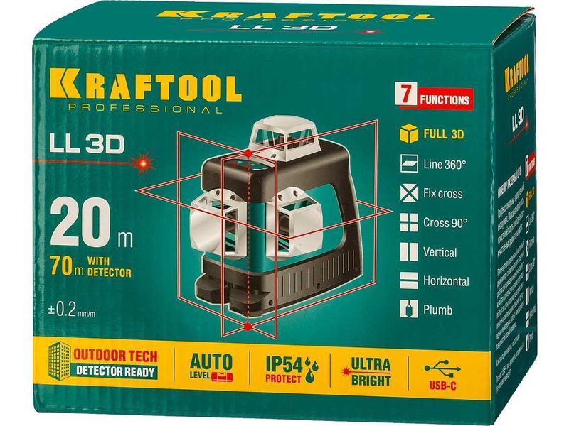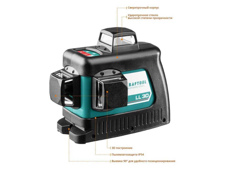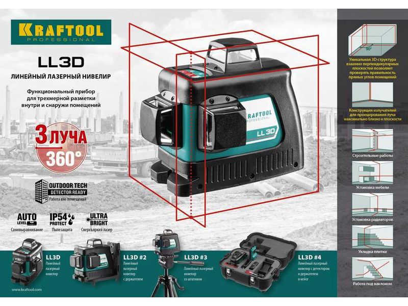 • 3 режима проецирования линий: горизонтальная и две вертикальные линии с разверткой 360°. благодаря чему луч будет виден в любой точке.