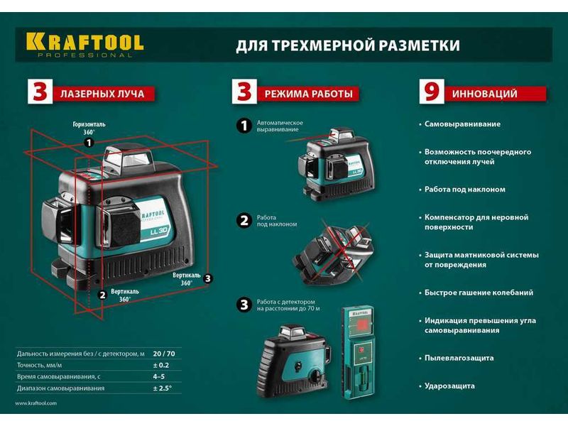 • Функция самовыравнивания устраняет необходимость настройки, гарантирует максимальную точность при разметке.