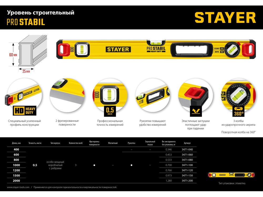 STAYER ProSTABIL 800 мм уровень строительный фрезерованный |