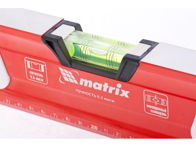 Алюминиевый уровень Matrix 34731 длиной 600 мм, магнитный, фрезерованный, с двухкомпонентными рукоятками, 3 глазками и 1 зеркальным отражателем, относится к категории измерительных инструментов. Служит для контроля отклонений поверхностей от горизонтали, вертикали и угла 45 градусов. Инструмент понадобится при осуществлении работ, требующих высокой точности.,Для определения отклонения вертикали 90 градусов необходимо использовать пузырьковую ампулу только в верхнем положении уровня. Только базовая поверхность является рабочей (противоположная ампуле 180 градусов).
