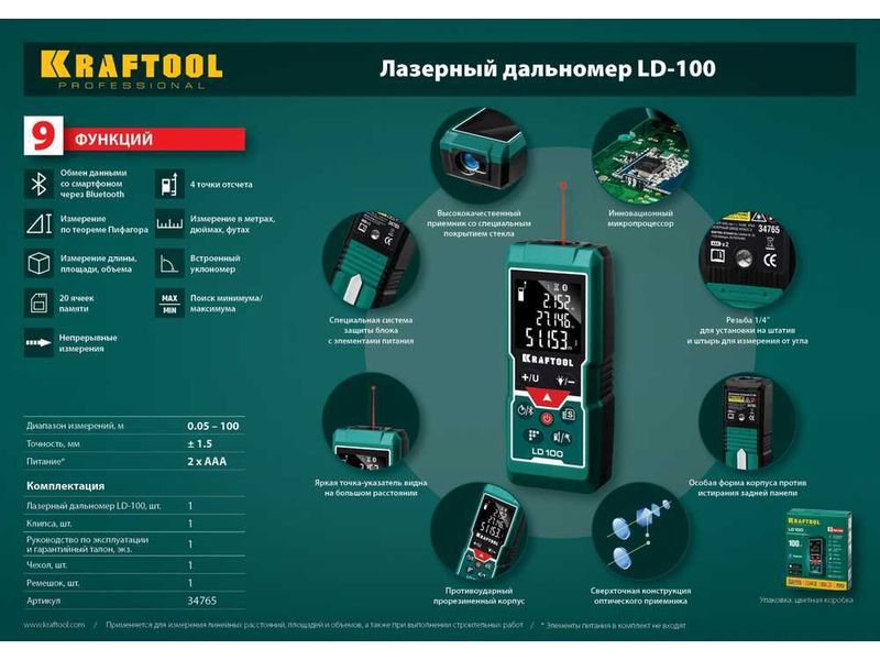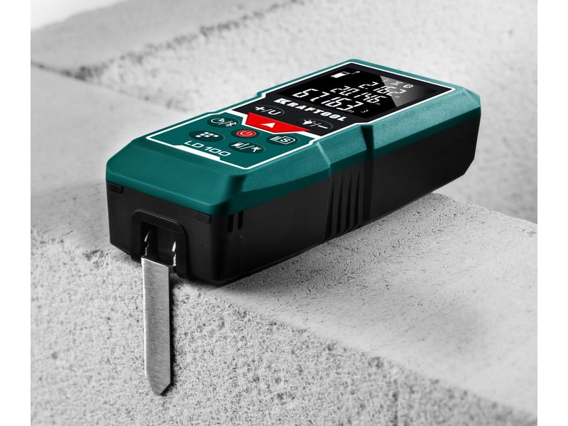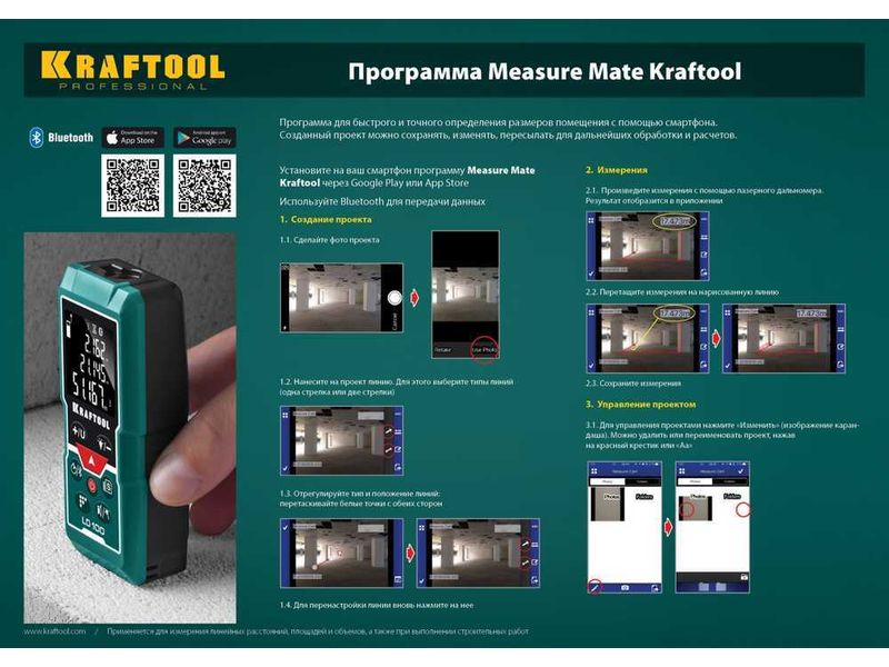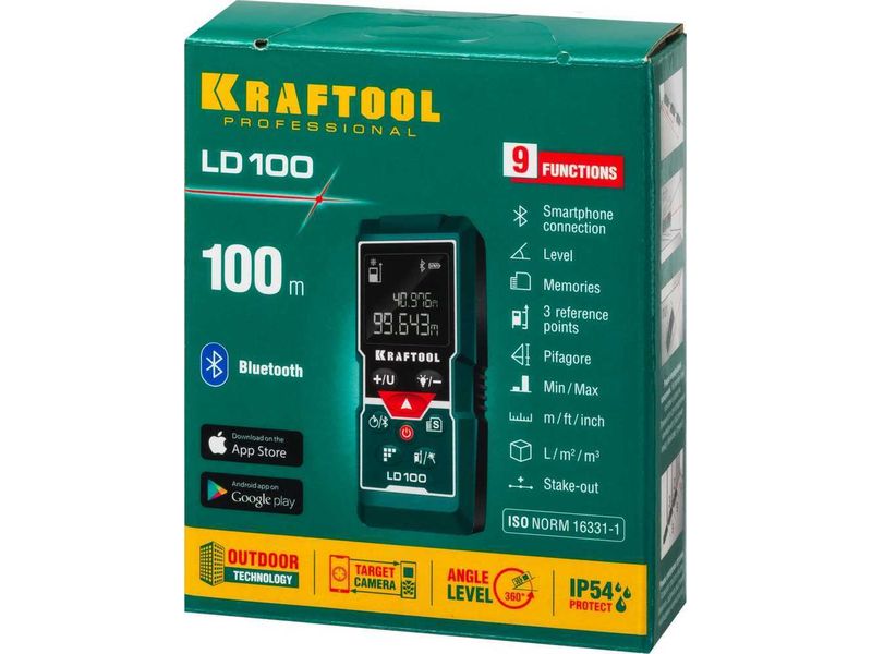 Профессиональный лазерный дальномер Kraftool - высокоточный прибор для быстрого и простого измерения линейных расстояний, площадей и объёмов. Позволяет проводить весь цикл измерений одному человеку, значительно ускоряя выполнение разметочных работ и повышая точность полученных данных.. Позволяет создавать дизайнерские проекты напрямую в вашем смартфоне. Возможность использования камеры смартфона в виде видоискателя.