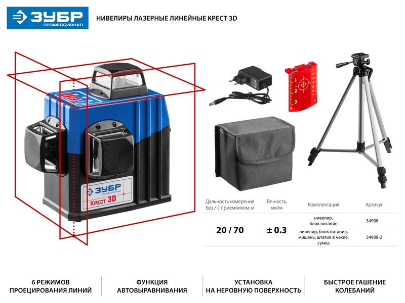 Измерительный инструмент Лазерный инструмент Нивелир лазерный линейный "Крест-3D", ЗУБР Профессионал 34908, двухлучевой, 20м / 50м (с приемником), точн. 0,3 мм/м-337