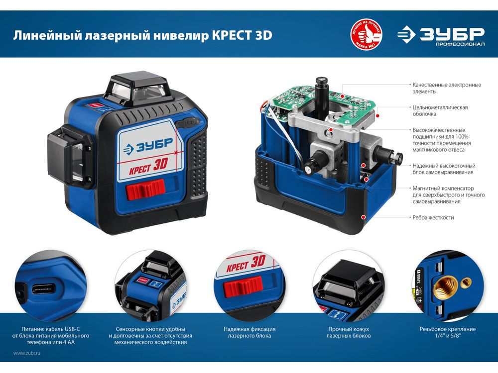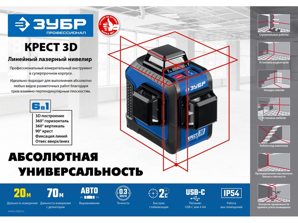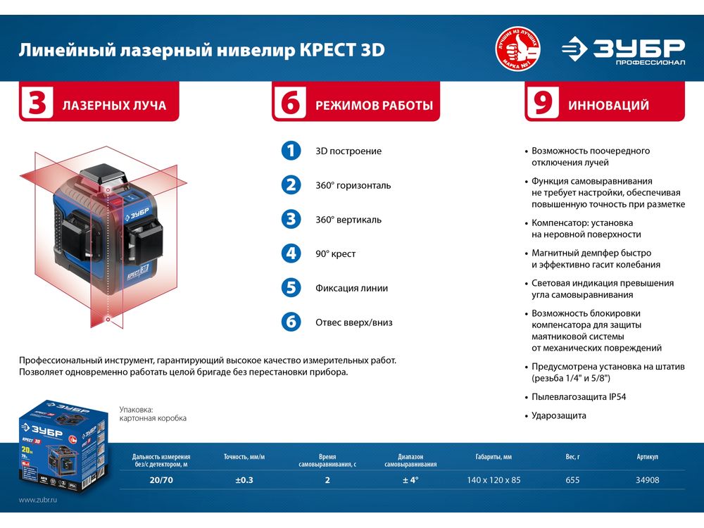 ЗУБР КРЕСТ 3D нивелир лазерный 3х360°, 20м/70м, точн. +/-0,3 мм/м