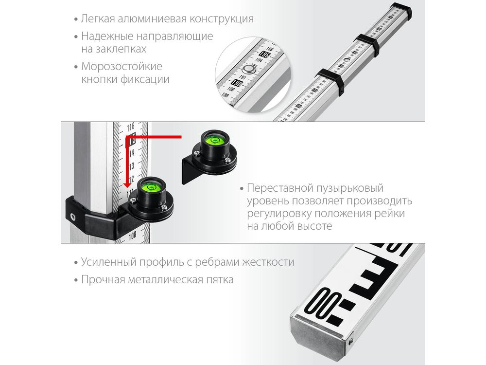 Профессиональный инструмент для работы с лазерным, оптическим инструментом для определения перепадов высоты. Имеет миллиметровую шкалу и E-градуировку .