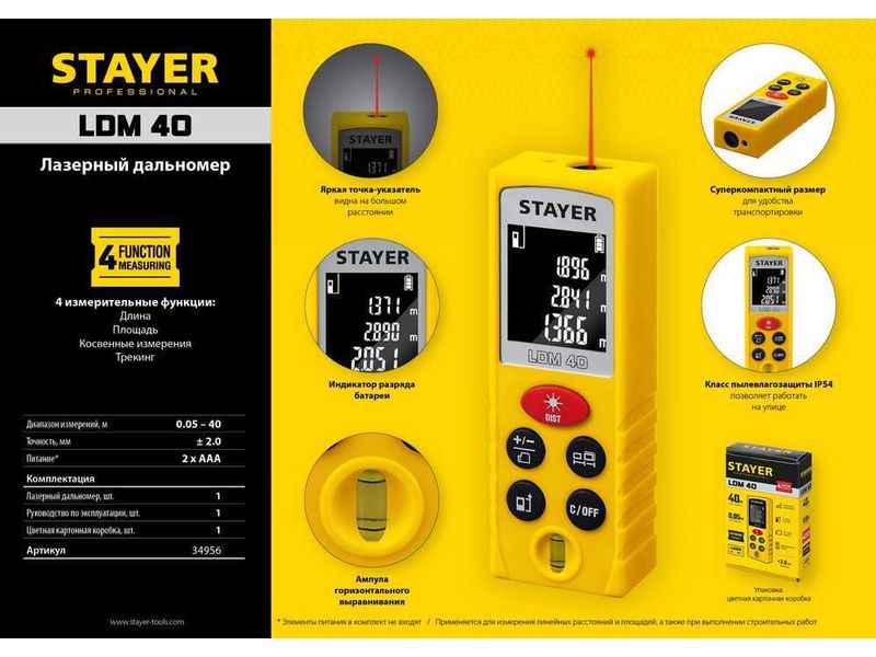 Дальномер лазерный, "LDM-40", дальность 40 м, 5 функций, STAYER Professional