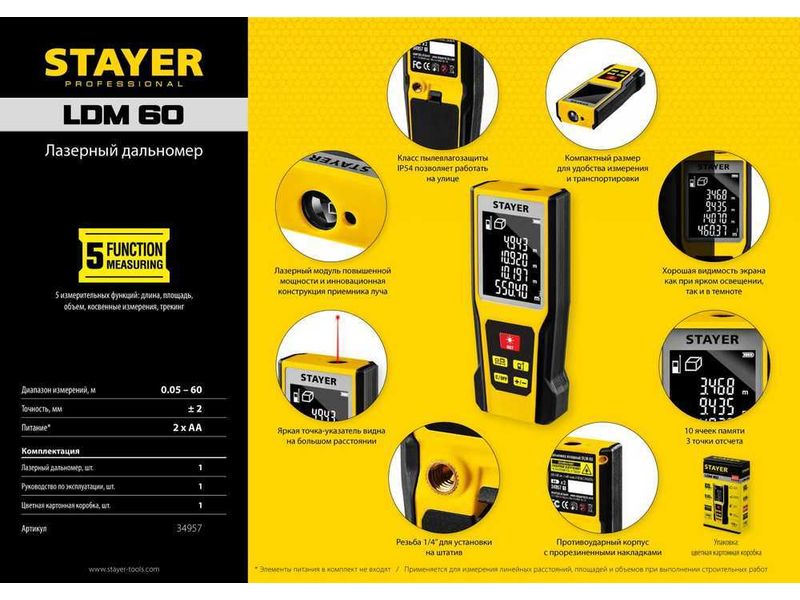 Дальномер лазерный, "LDM-60 ", дальность 60 м, 5 функций, STAYER Professional
