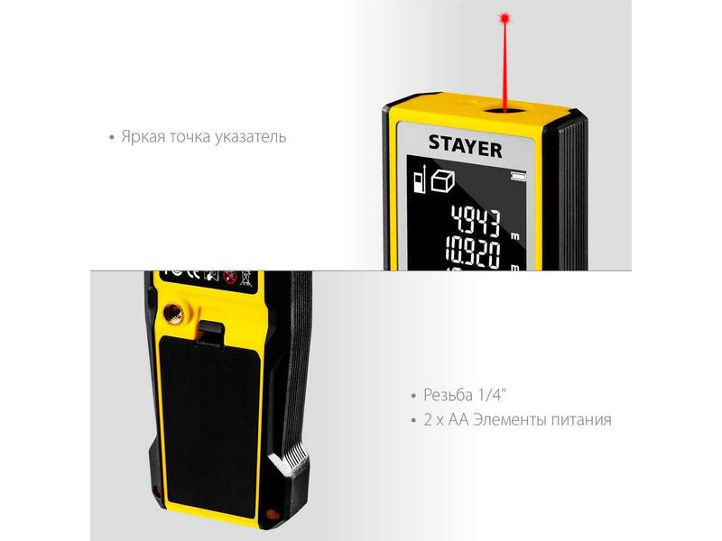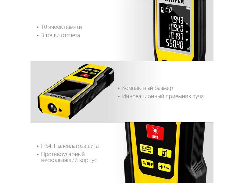 Лазерный дальномер Stayer LDM50 – это высокоточный прибор для быстрого и простого измерения линейных расстояний, площадей и объёмов. Позволяет проводить весь цикл измерений одному человеку, значительно ускоряя выполнение разметочных работ и повышая точность полученных данных.