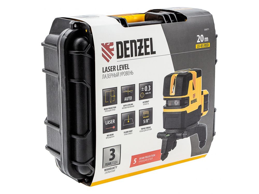 Лазерный уровень Denzel LX 05 Red 35071 предназначен для построения линий разметки на стенах, полу и потолке при проведении строительно-ремонтных работ. Благодаря длине волны лазера 635 Нм дальность проецирования уровня составляет 20 м. Уровень проецирует на поверхности точку отвеса, 4 вертикальных и 1 горизонтальную линию. Функция автоматического выравнивания имеет высокую точность ±0,3мм/м. Угол развертки прибора составляет 240 градусов.