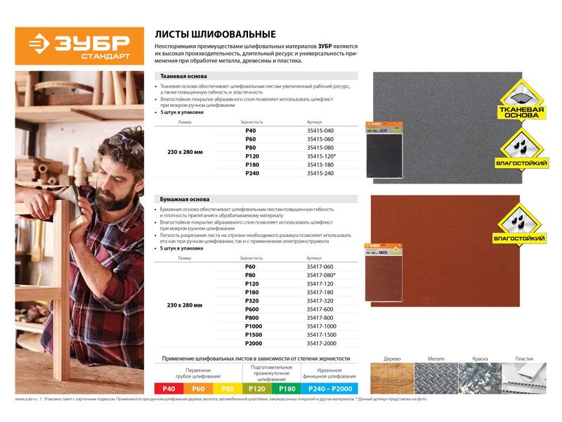 Неоспоримыми преимуществами шлифовальных материалов ЗУБР является их высокая производительность, длительный ресурс и универсальность применения при обработке металла, древесины и пластика.