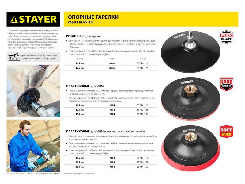 Основными достоинствами опорных тарелок Stayer являются их высокая эффективность, повышенная гибкость и элестичность, длительный рабочий ресурс и универсальность использования при обработке различных строительных и отделочных материалов.