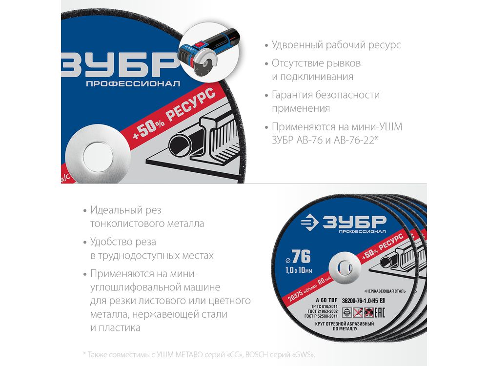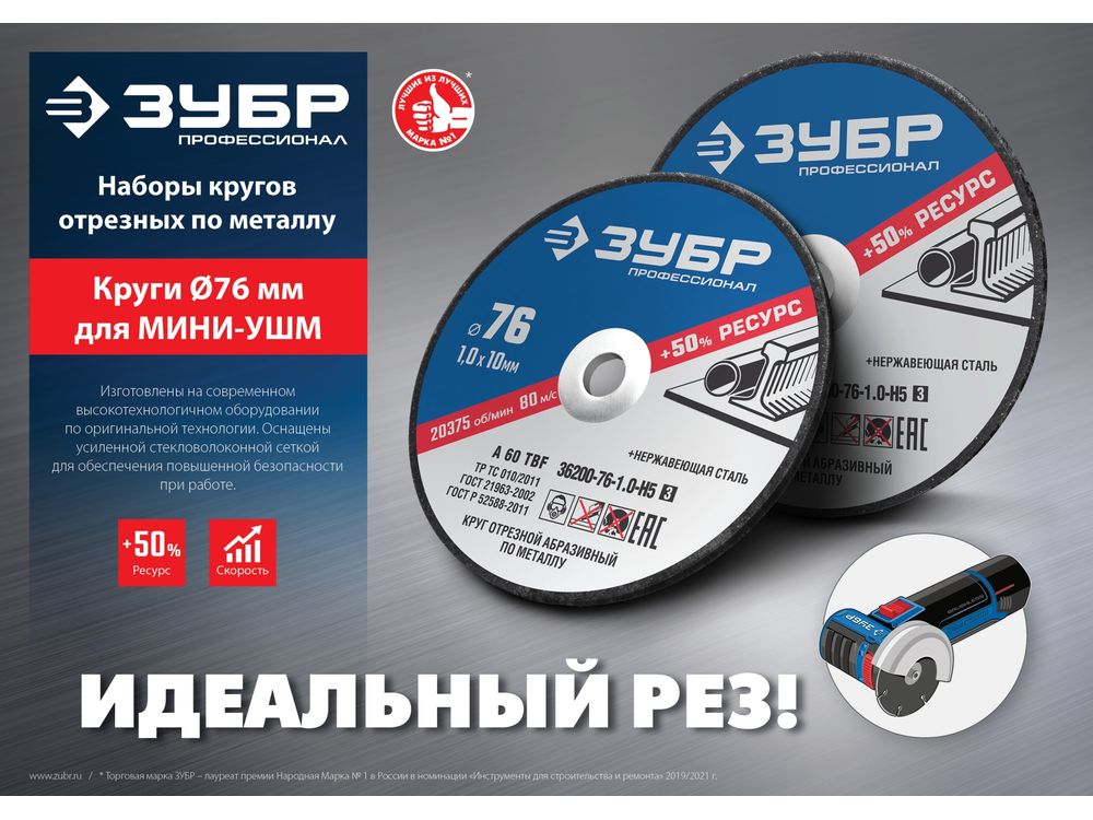 Отрезные абразивные круги ЗУБР предназначены для высокопроизводительной резки листового металла, а также конструкционных, высоколегированных и углеродистых сталей.