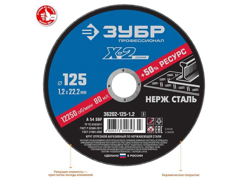 Круг отрезной "X-2" по нержавеющей стали, 125х1,2х22,23мм, ЗУБР