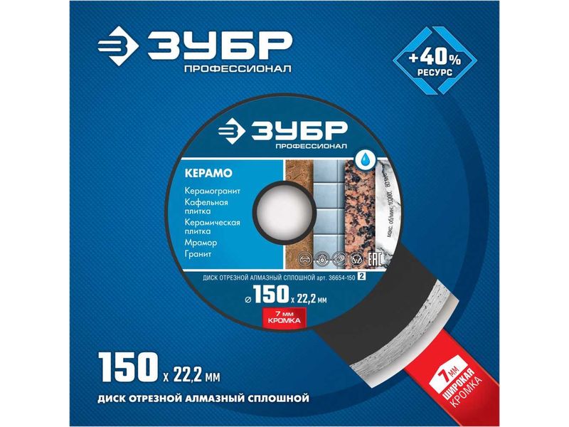 Купить Диск отрезной алмазный сплошной КЕРАМО, d-150 мм, ЗУБР Профессионал 36654-150