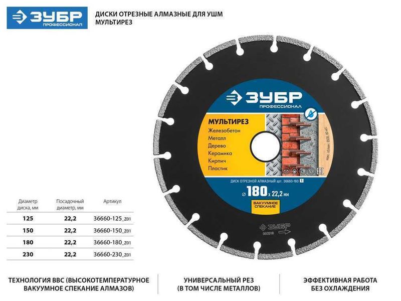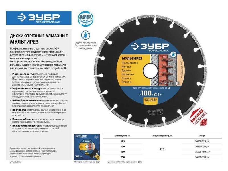 Исключительно высокий уровень качества отрезных алмазных дисков ЗУБР гарантирован комплексной системой контроля всего процесса производства: от качества поступающего сырья до готовой продукции. Корпуса алмазных дисков изготовлены из прочной легированной стали, способной выдержать значительную механическую нагрузку и высокую температуру.
