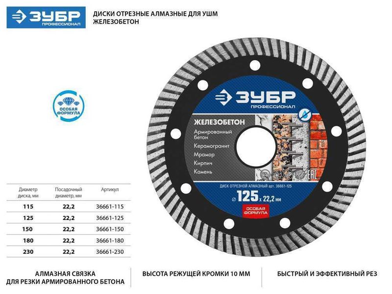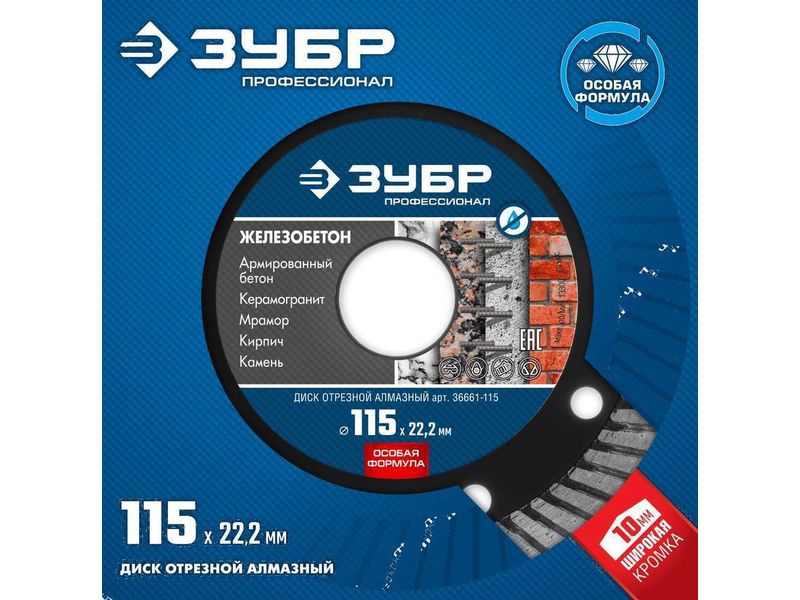Диск отрезной алмазный: ЖЕЛЕЗОБЕТОН, d-115 мм, ЗУБР Профессионал 36661-115
