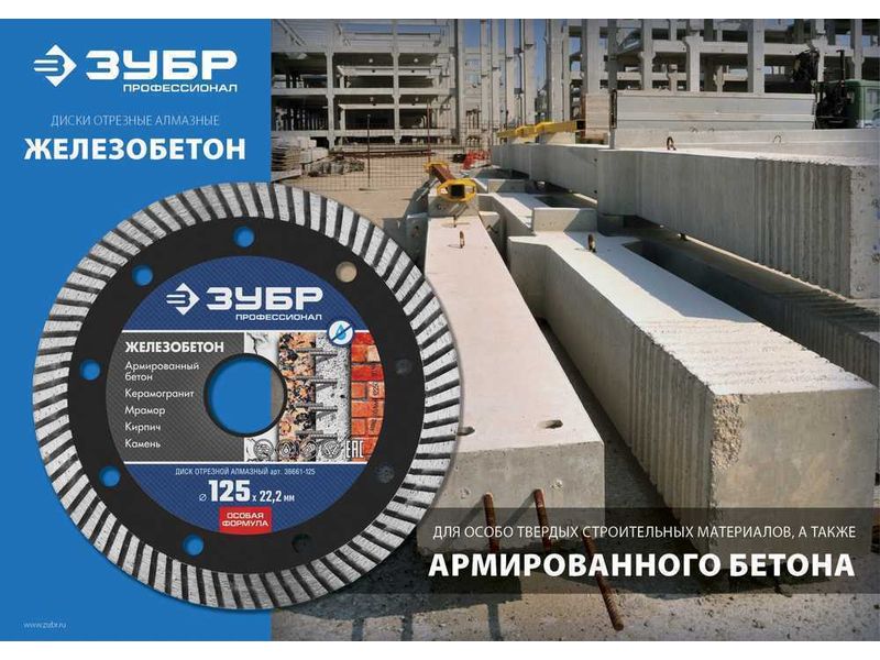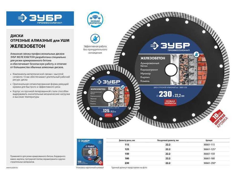 Диск отрезной алмазный: ЖЕЛЕЗОБЕТОН, d-230 мм, ЗУБР Профессионал 36661-230