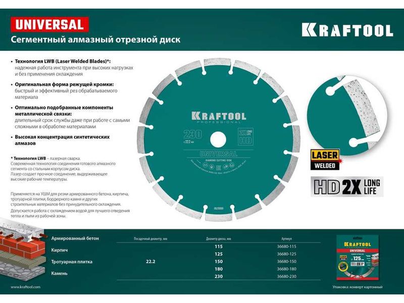 Алмазные отрезные диски Kraftool - профессиональный инструмент изготовленный на современных автоматических линиях по новейшим технологиям и отвечающий самым высоким стандартам качества.