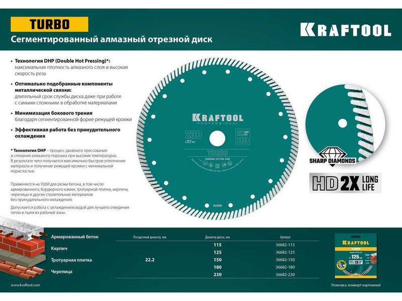Технология DHP (Double Hot Pressing) - процесс двойного спекания при высоких темепературах обеспечивает максимальную плотность алмазоносного слоя, высокую скорость реза и увеличенный срок эксплуатации инструмента по сравнению с обычными дисками