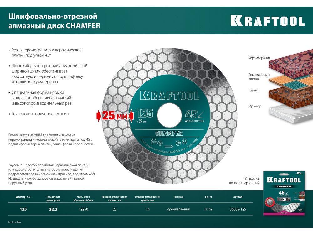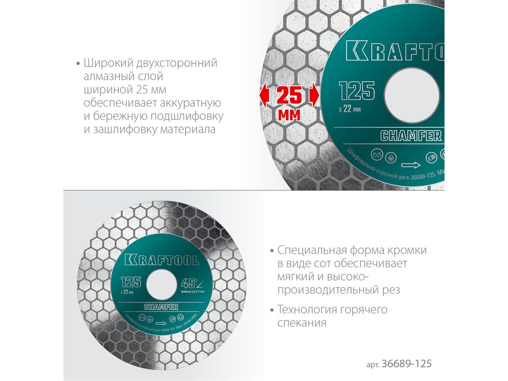KRAFTOOL CHAMFER 125 мм (22.2 мм, 25х1.6 мм) Шлифовально-отрезной алмазный диск (36689-125)