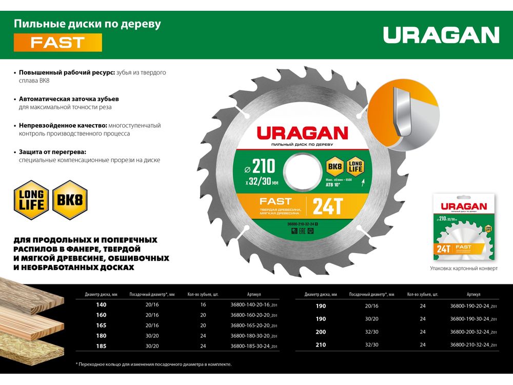 URAGAN Fast 190х20/16мм 24Т, диск пильный по дереву