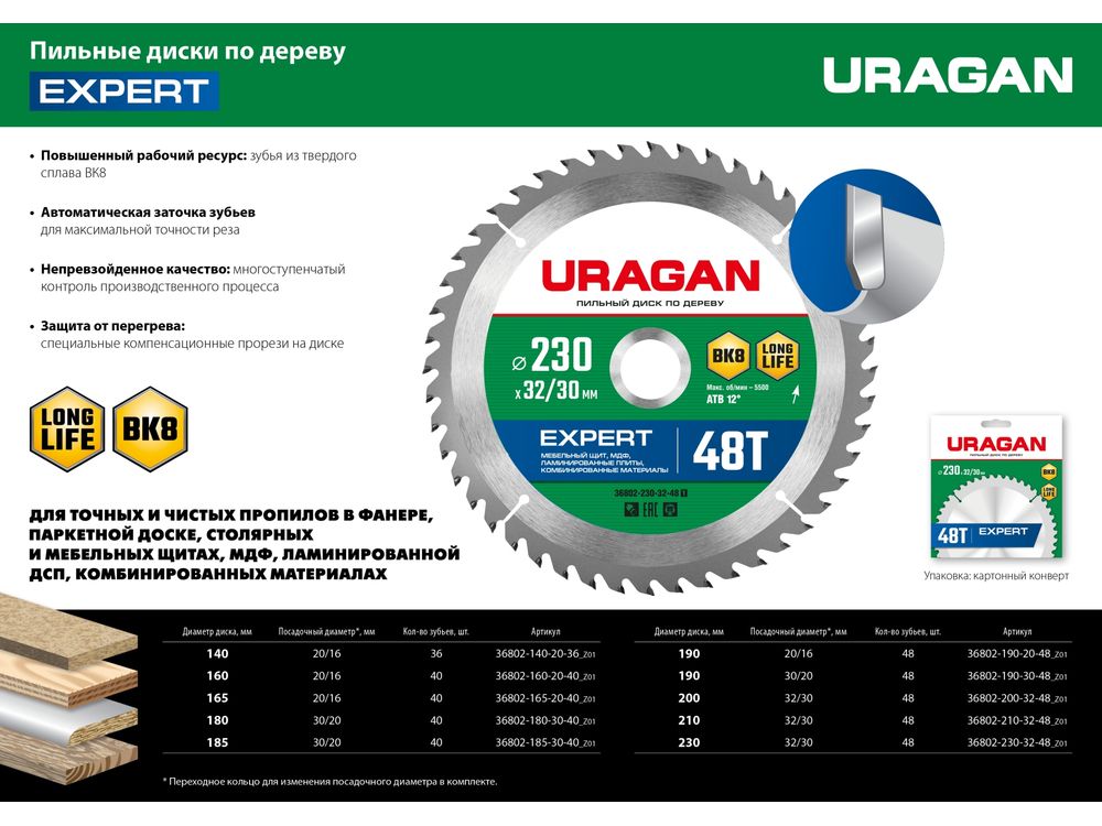 Особая форма твердосплавного зуба с переменным углом наклона верхней плоскости специально разработана для эффективного и производительного пиления фанеры, паркетной доски, столярных и мебельных щитов, МДФ, ламинированной ДСП, комбинированных материалов.