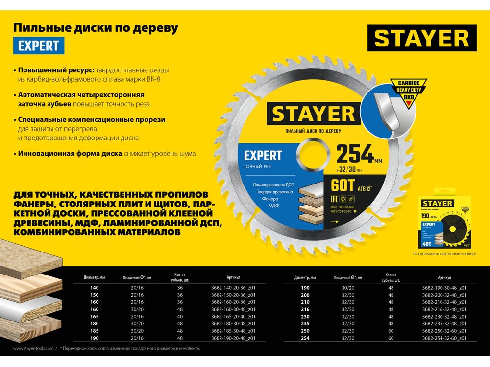 Серия EXPERT рекомендована для для точных, качественных пропилов фанеры, столярных плит и щитов, паркетной доски, прессованной клееной древесины, МДФ, ламинированной ДСП, комбинированных материалов.