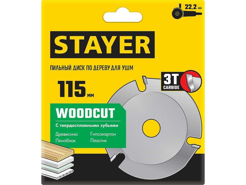 STAYER WOODCUT 115х22,2мм, 3 резца, диск пильный по дереву для УШМ
