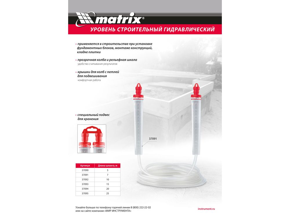 Гидроуровень Matrix 37090 с удлиненными колбами и рельефной градуировкой предназначен для выравнивания объектов на расстоянии до 5 м. Используется при проведении ремонтно-строительных работ: изготовлении опалубки, установке фундамента, кладке плитки. Особо светлые колбы с рельефной градуировкой облегчают считывание результатов измерения.