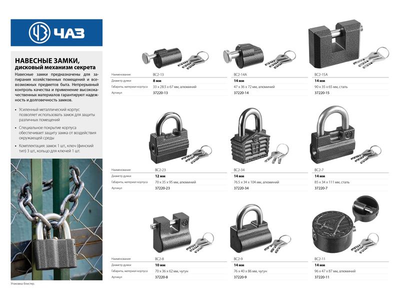 Навесные замки предназначены для запирания хозяйственных помещений и всевозможных предметов быта. Непрерывный контроль качества и применение высококачественных материалов гарантируют надежность и качество замков.