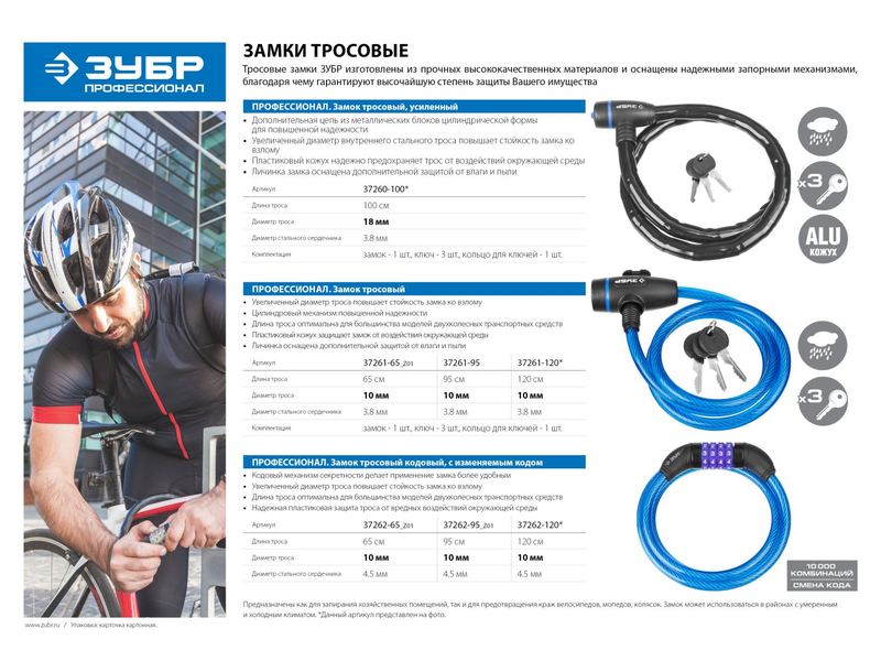 Замок навесной тросовый предназначен как для запирания хозяйственных помещений, так и для предотвращения краж велосипедов, мопедов, колясок и др. Замок может использоваться в районах с умеренным и холодным климатом.