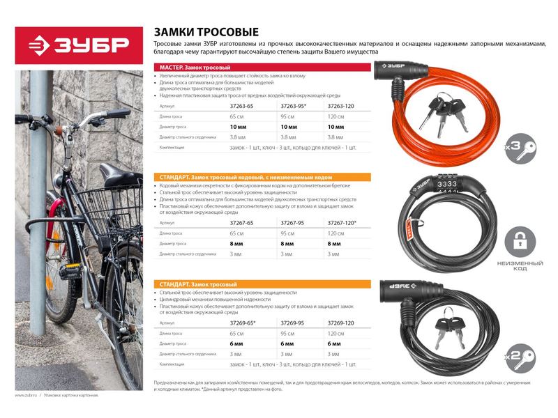 Замок навесной тросовый предназначен как для запирания хозяйственных помещений, так и для предотвращения краж велосипедов, мопедов, колясок и др. Замок может использоваться в районах с умеренным и холодным климатом.