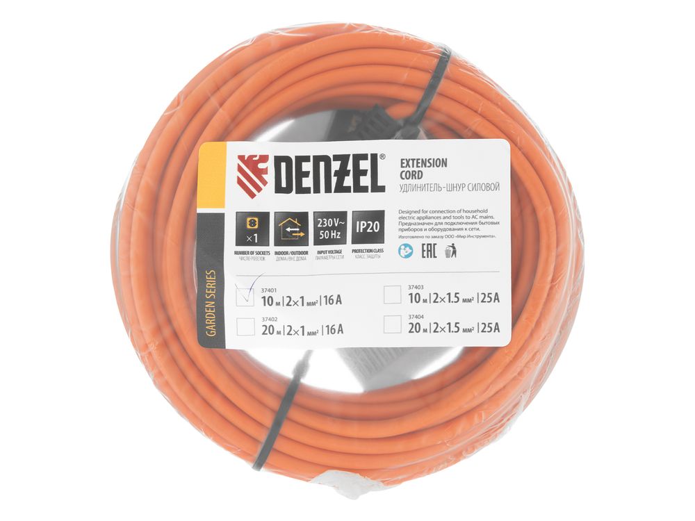Силовой удлинитель-шнур Denzel Garden Series 37401 с кабелем ПВС сечением 2 x 1 мм, и 1 розеткой без заземления, позволяет подключать приборы к электросети на расстоянии до 10 м от стационарного источника питания. Максимальная мощность потребителя составляет 3500 Вт при полностью размотанном кабеле и 1750 Вт — при смотанном. Удлинитель может использоваться при температуре от +5 до +35 °C. Пригодится дома, на даче, в гараже.