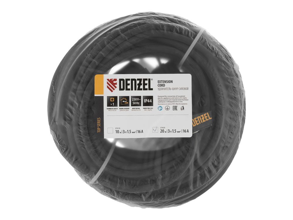 Силовой удлинитель-шнур Denzel Top Series 37420 с 1 розеткой, с кабелем КГТТ сечением 3 x 1,5 мм и длиной 20 м, предназначен для подключения электроприборов на удалении от розетки. Максимальная мощность потребителя составляет 3680 Вт для полностью размотанного кабеля и 1840 Вт — для смотанного. Удлинитель подходит для подключения электроинструмента, будет полезен на строительной площадке и в быту.