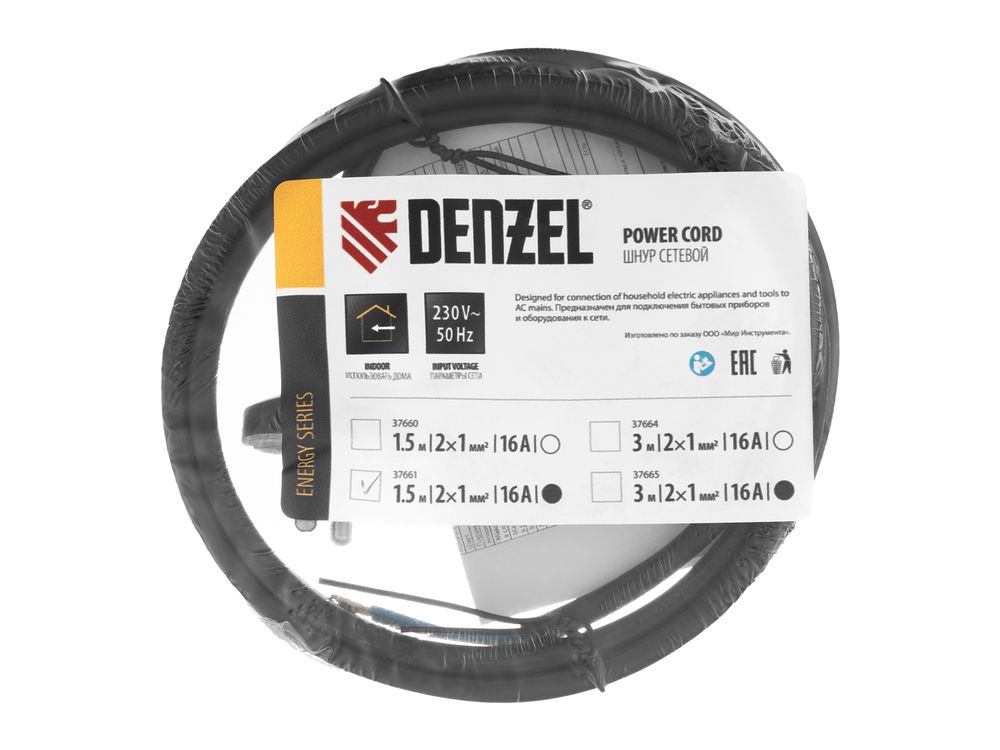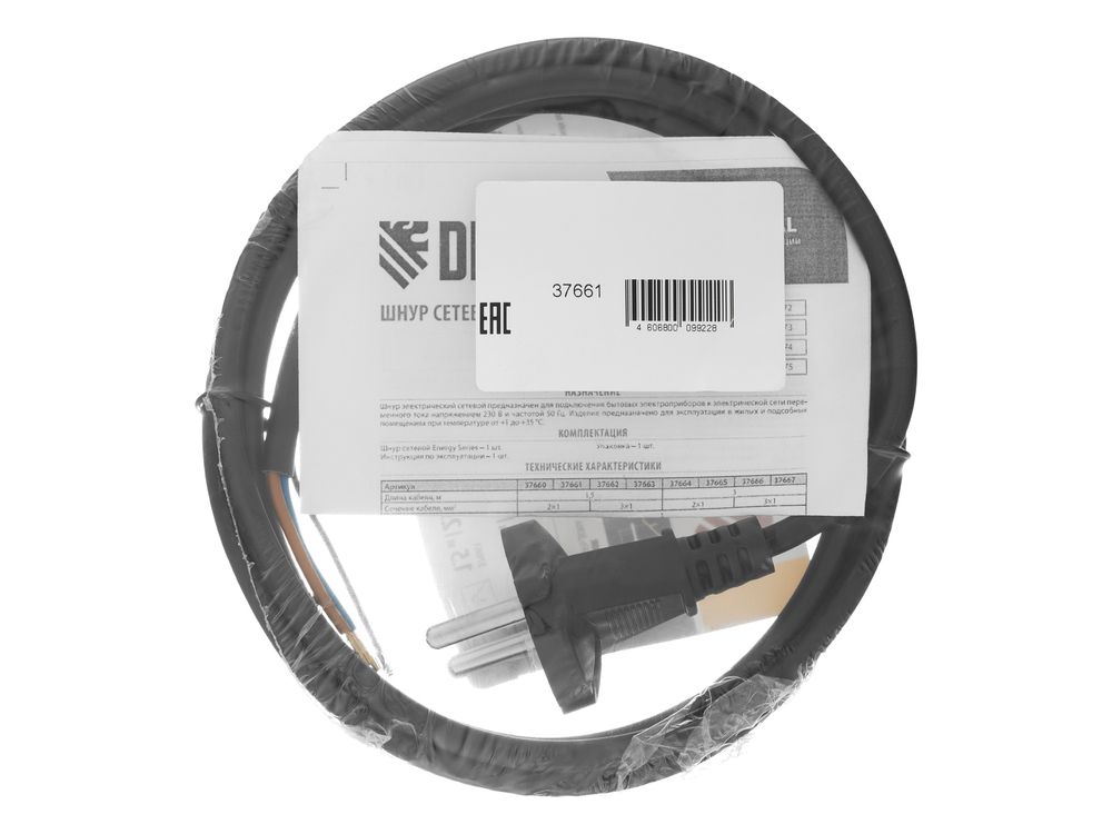 Шнур сетевой Energy Series, ПВС, 1,5 м, 2 x 1 мм, с неразборной вилкой, черный,-684