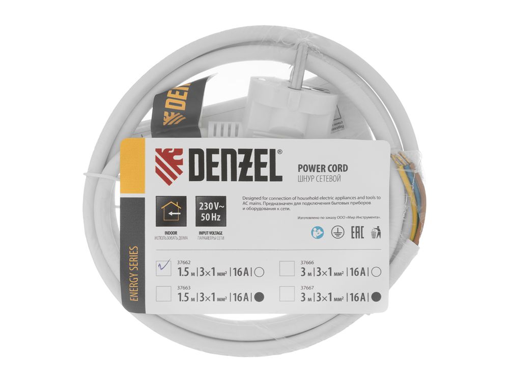 Шнур сетевой Energy Series, ПВС, 1,5 м, 3 x 1 мм, с неразборной вилкой, белый,-684