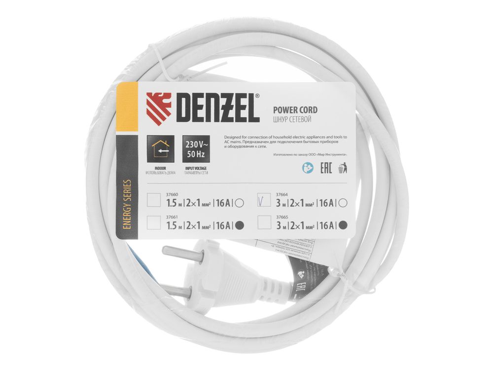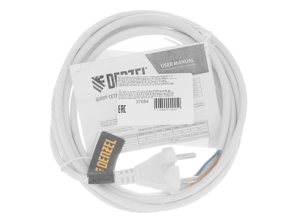 Белый сетевой шнур Denzel Energy Series 37664 с кабелем ПВС сечением 2 x 1 мм и длиной 3 м, с неразборной вилкой, предназначен для подключения к сети электроприборов мощностью до 3500 Вт. Для смотанного кабеля максимальная мощность потребителя составляет 1750 Вт. Шнур можно использовать для самостоятельного подключения прибора или замены вышедшего из строя провода. Сделано в России.