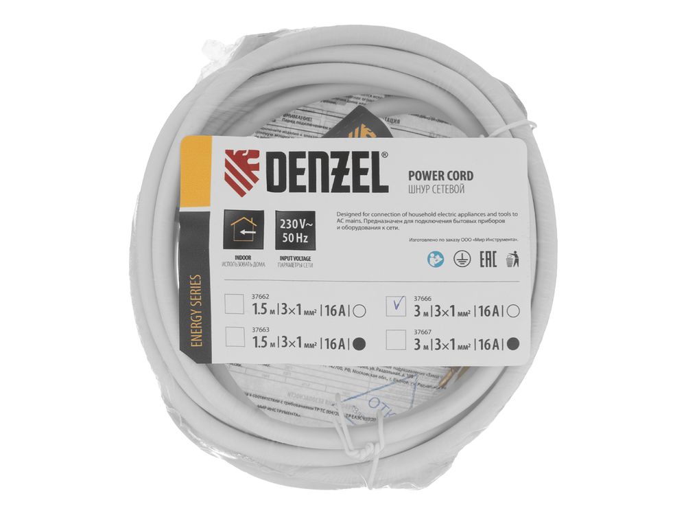 Белый сетевой шнур Denzel Energy Series 37666 с кабелем ПВС сечением 3 x 1 мм и длиной 3 м, с неразборной вилкой, предназначен для подключения к сети электроприборов мощностью до 3500 Вт. Для смотанного кабеля максимальная мощность потребителя составляет 1750 Вт. Шнур можно использовать для самостоятельного подключения прибора или замены вышедшего из строя провода. Сделано в России.