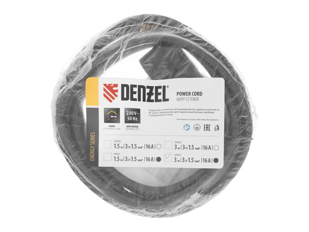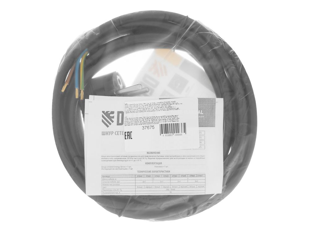 Шнур сетевой Energy Series, ПВС, 3 м, 3 x 1,5 мм, с неразборной вилкой, черный,-684