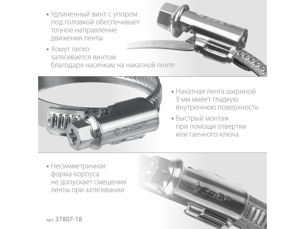 ЗУБР Х-9Н 10-18 мм, накатная лента 9 мм, червячный хомут, цинк, 50 шт (37807-18)