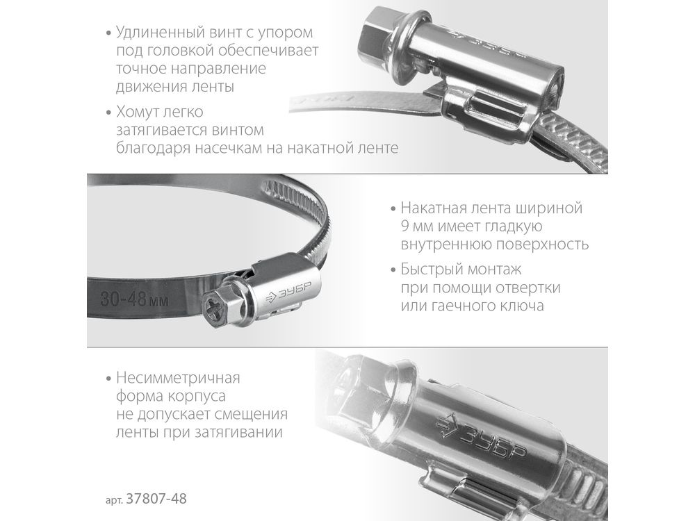 ЗУБР Х-9Н 30-48 мм, накатная лента 9 мм, червячный хомут, цинк, 50 шт (37807-48)