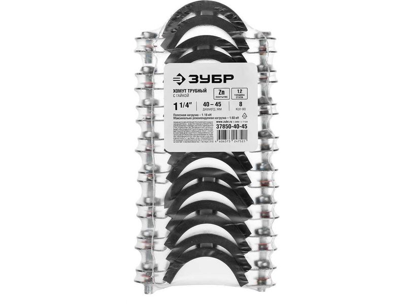 Хомут трубный с гайкой, оцинкованный, 1 1/4", 8шт, ЗУБР Мастер 37850-40-45