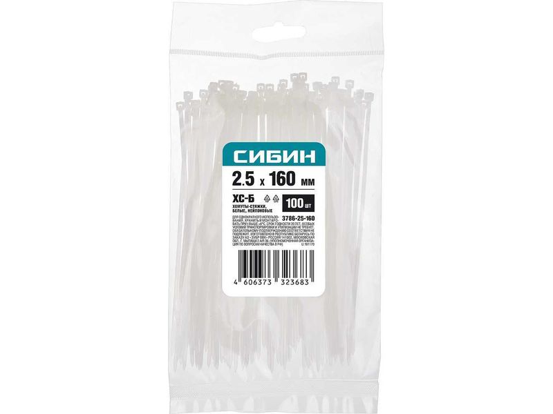 Хомуты-стяжки белые ХС-Б, 2.5 х 160 мм, 100 шт, нейлоновые, СИБИН