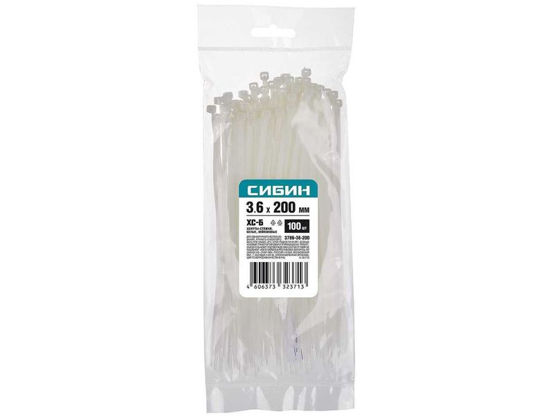 Хомуты-стяжки белые ХС-Б, 3.6 х 200 мм, 100 шт, нейлоновые, СИБИН