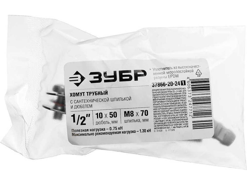 Хомут трубный с гайкой, оцинкованный, в комплекте с сантехнической шпилькой и дюбелем, 1/2, 1шт, ЗУБР